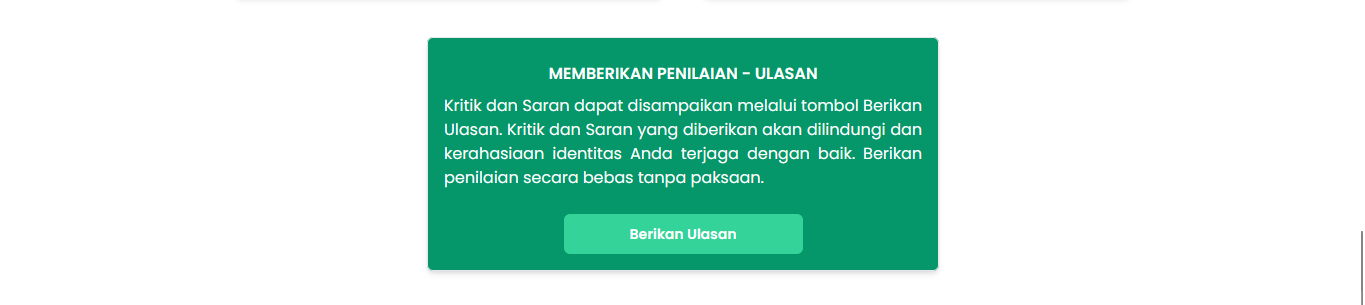 Kritik dan Saran dapat disampaikan melalui tombol Berikan Ulasan. Kritik dan Saran yang diberikan akan dilindungi dan kerahasiaan identitas Anda terjaga dengan baik. Berikan penilaian secara bebas tanpa paksaan.